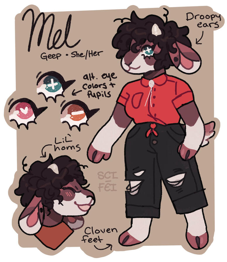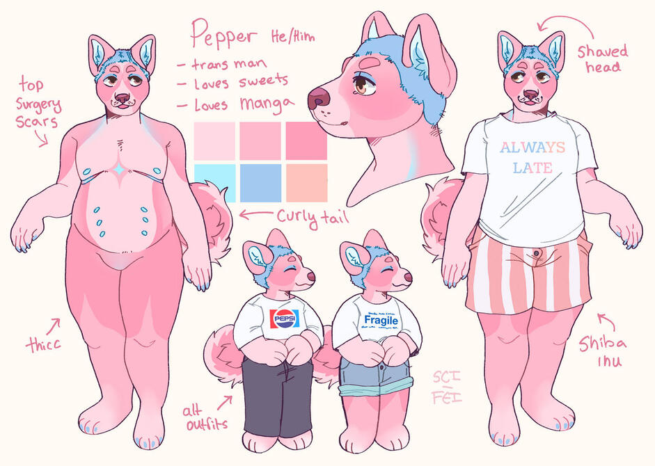 Includes: 1 fullbody, 1 headshot, 2 chibis with clothes/alternate colors/markings, and small notes about the character